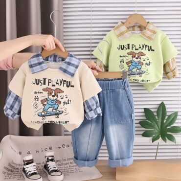 طقم ولادي يتكون من شميز بأكمام طويلة مع تيشيرت ملتصق وبنطلون جينز للأولاد الصغار