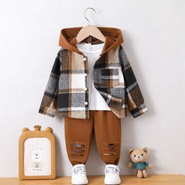 طقم ولادي راقي يتكون من تيشيرت وجاكت بأكمام طويلة وبنطلون للأولاد الصغار