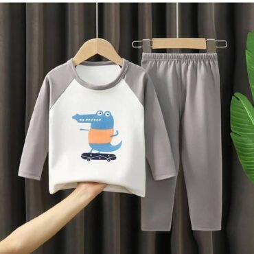 طقم بيجاما شتوي مبطن من الداخل مكون من بلوفر بأكمام طويلة وسروال بخصر مرن نمط ديناصورات