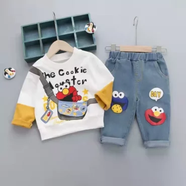 طقم كاجوال أنيق مكون من قطعتين بلوفر وبنطلون تصميم فخم ثلاثي الابعاد مناسب للأولاد والبنات الصغار.
