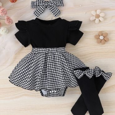 طقم بناتي يتكون من فستان بأكمام قصيرة وربطة رأس وجوارب بتصميم راقي للبنات الرضع