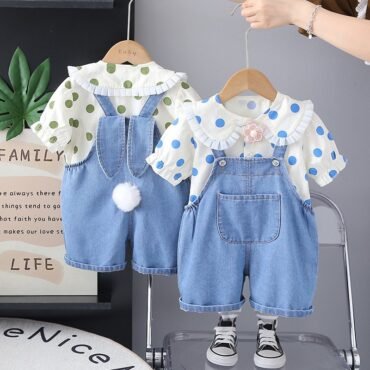 طقم بناتي يتكون قطعتين شيال جينز وشميز بأكمام قصيرة
