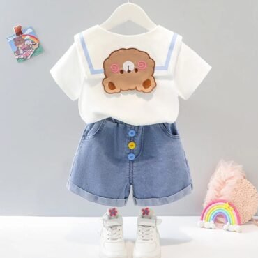 طقم بناتي يتكون من بلوزة بأكمام قصيرة وشورت جينز يحتوي على جيوب جانبية مع حزام