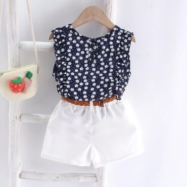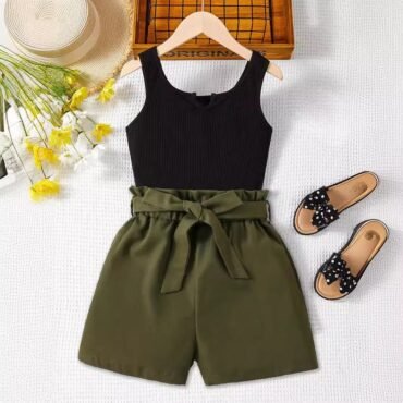 طقم بناتي يتكون من بلوزة بدون أكمام وشورت مع حزام للخصر للفتيات الصغيرات.