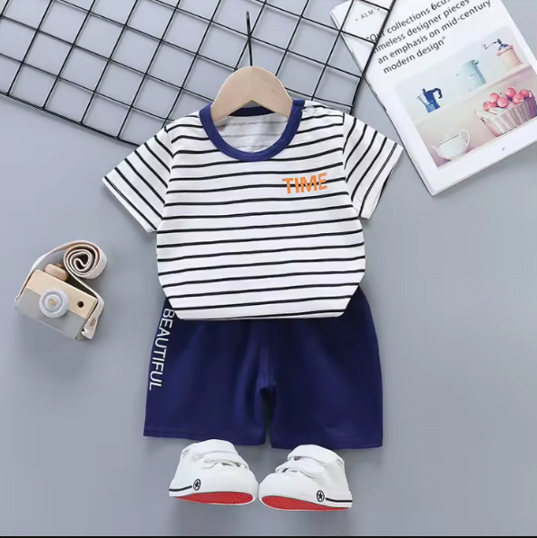 طقم شورت ولادي مكون من قطعتين تي شيرت نمط مخطط وشورت