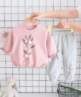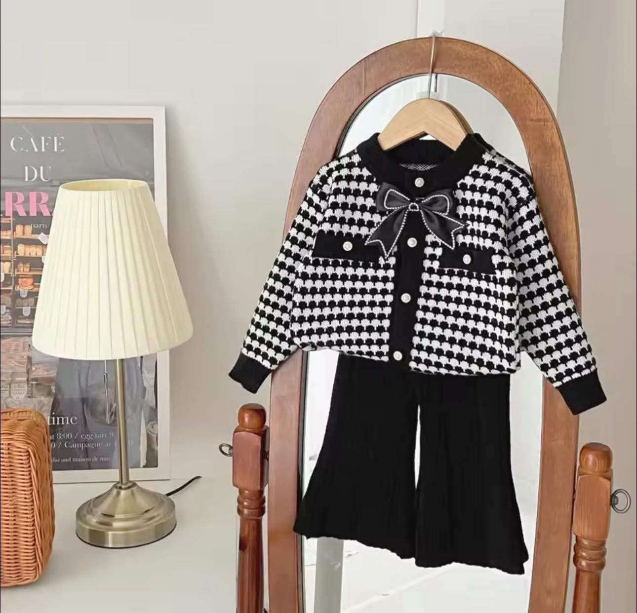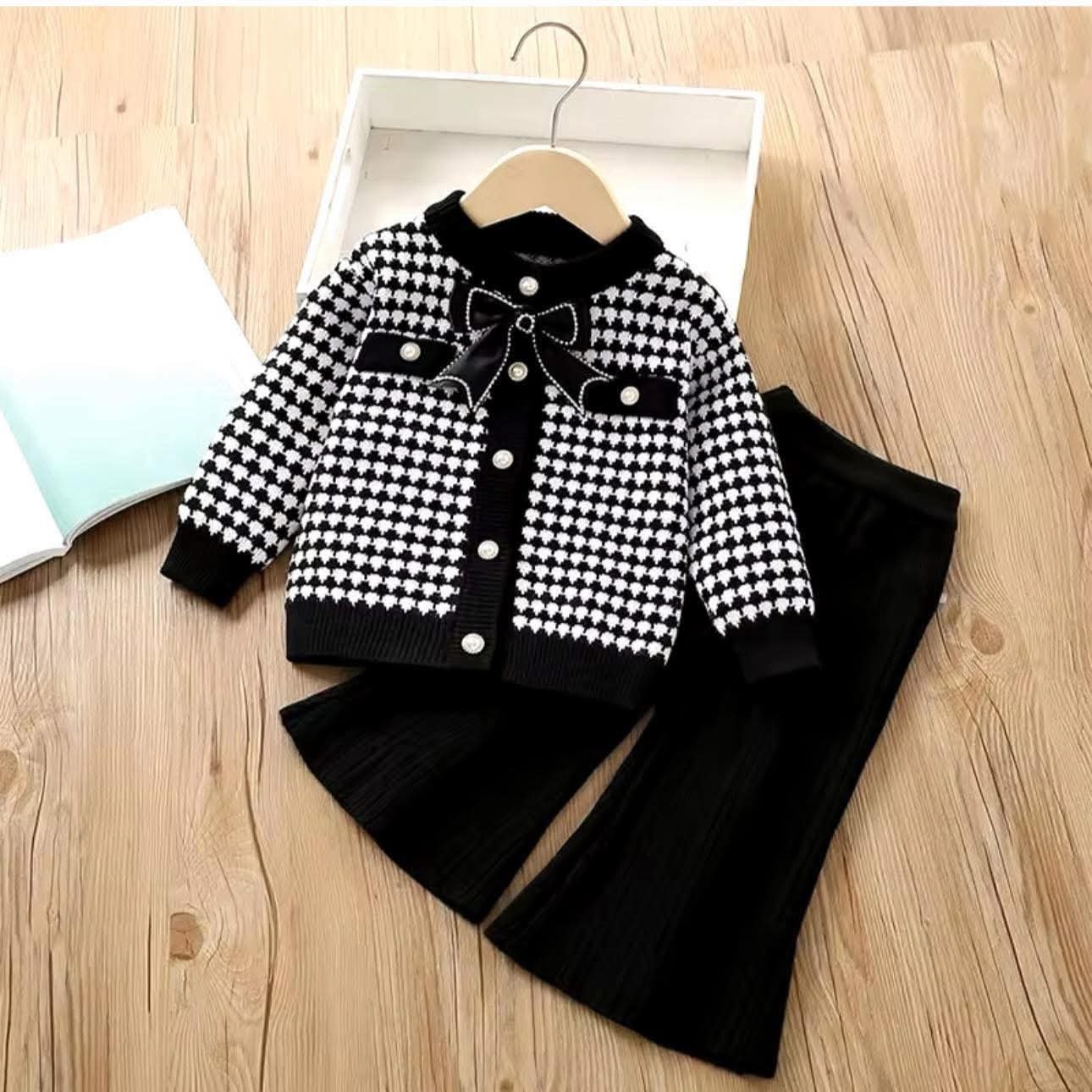 طقم راقي يتكون سترة بأكمام طويلة مزين بفيونكة وبنطلون بتصميم فرنسي للفتيات الصغيرات