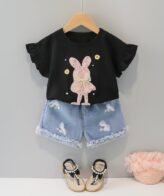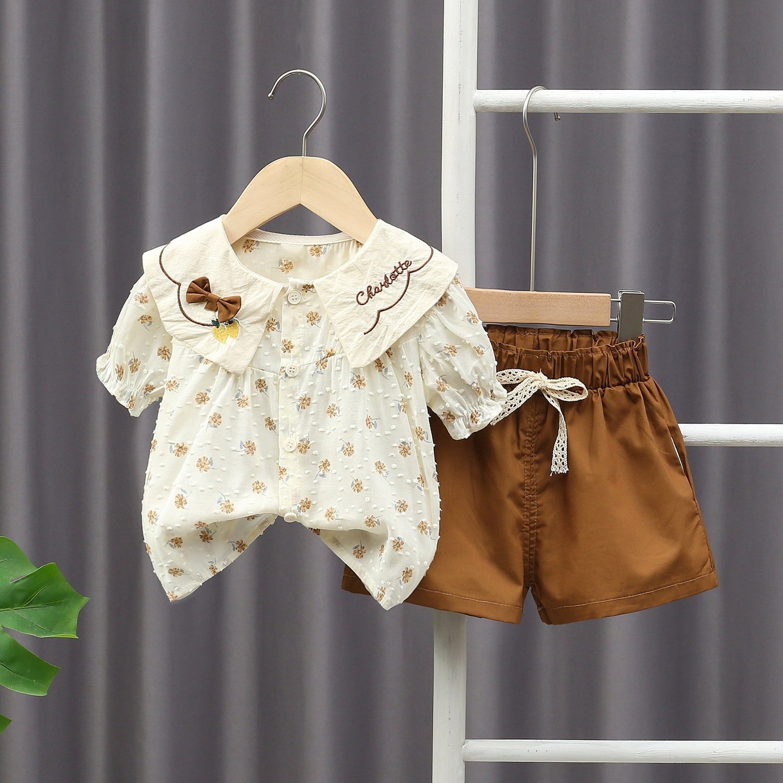 طقم بناتي يتكون من قطعتين، بلوزة بأكمام قصيرة وشورت للفتيات الصغيرات