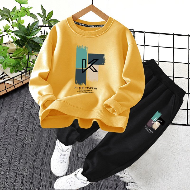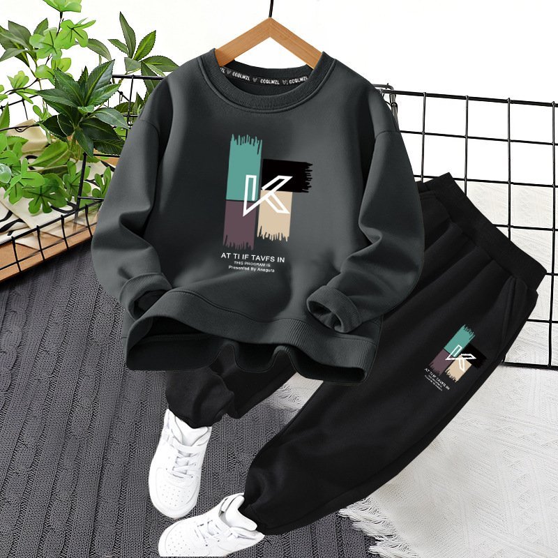 طقم للأولاد يتكون من قطعتين، بلوفر بأكمام طويلة وبتصميم رسومي تجريدي وبنطلون سادة بتصميم عصري ومريح