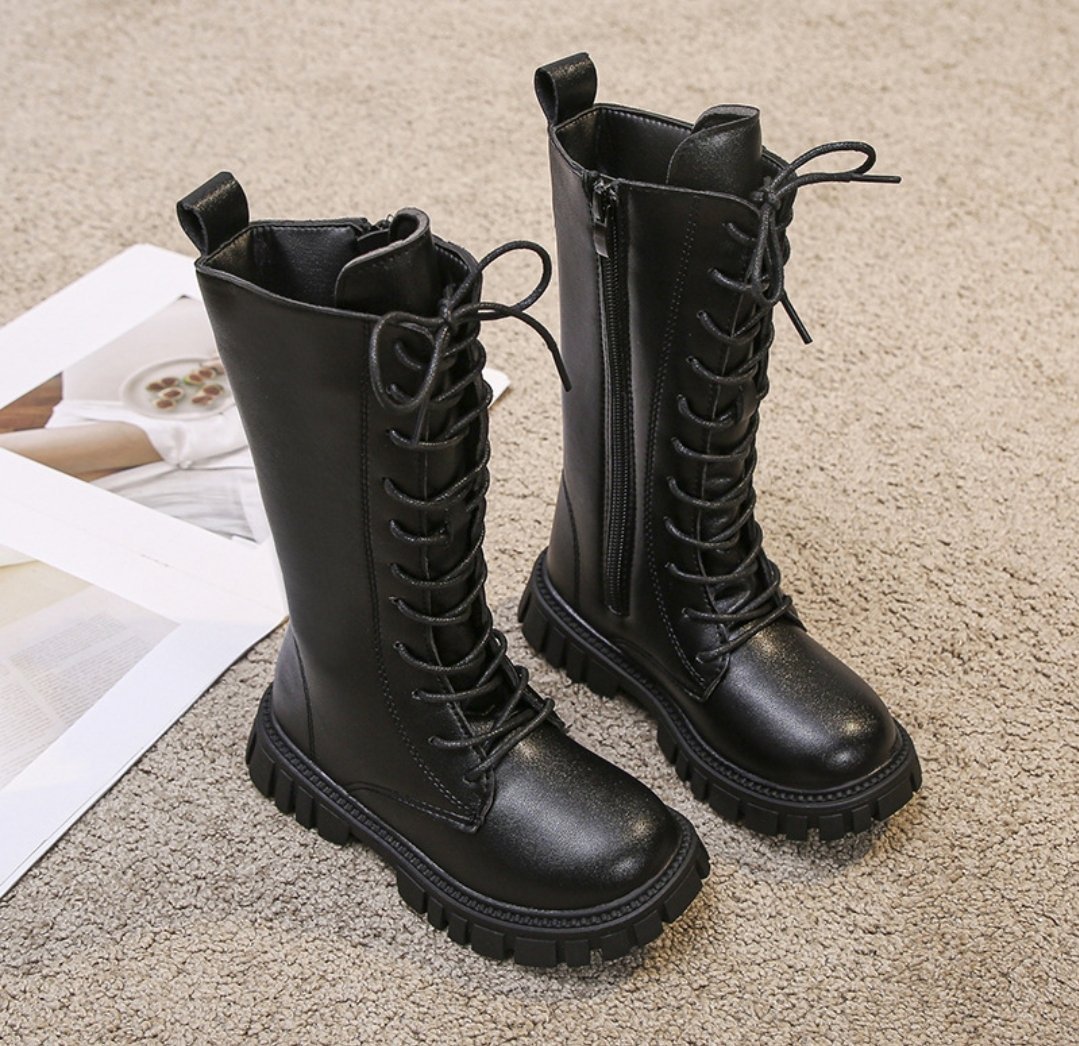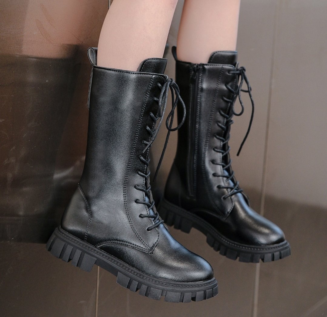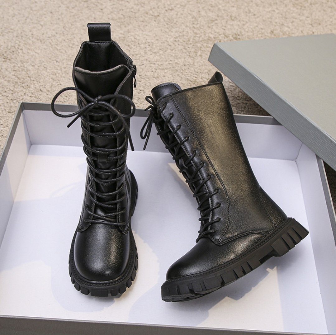حذاء بناتي طويل من الجلد الفاخر على رباط أمامي
