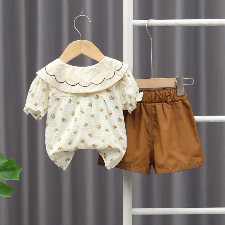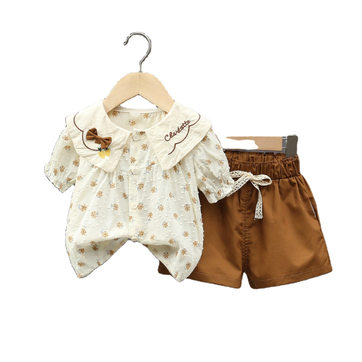طقم بناتي مكون من بلوزة مكشكشه بأكمام قصيره وشورت